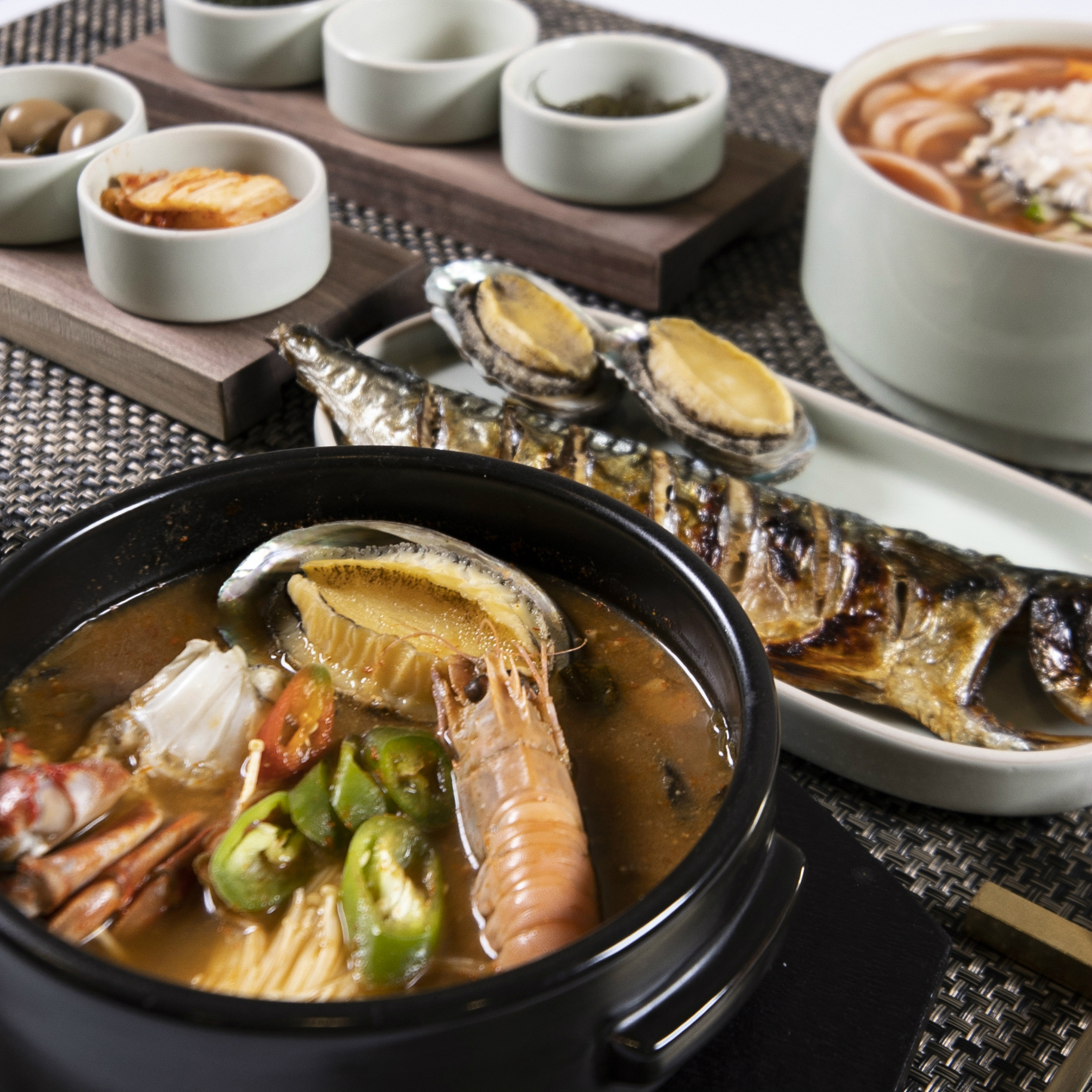전복과 성게를 기반으로 생선구이를 곁들인 한식입니다.