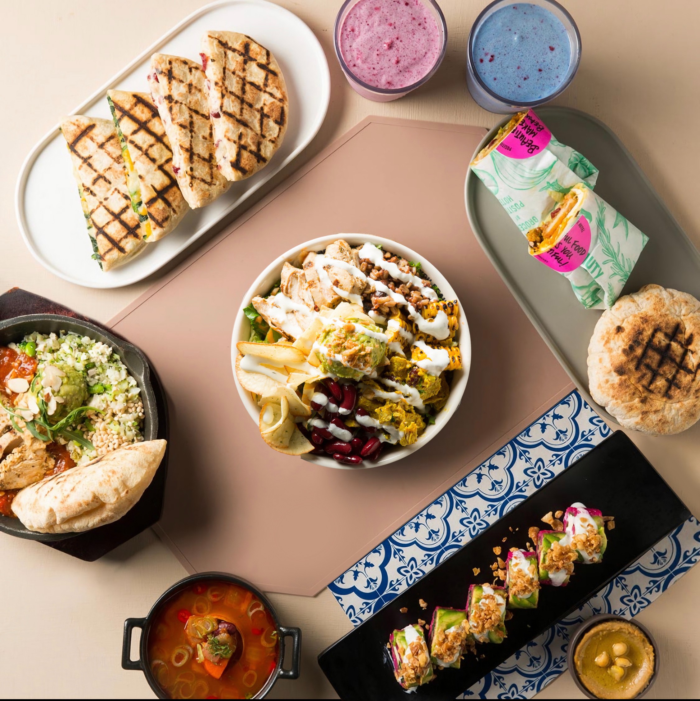 주요 메뉴 - 지중해 마켓볼, 트러플 비트 스시, 단백질 쉐이크 홀그레인, 쓰리베리