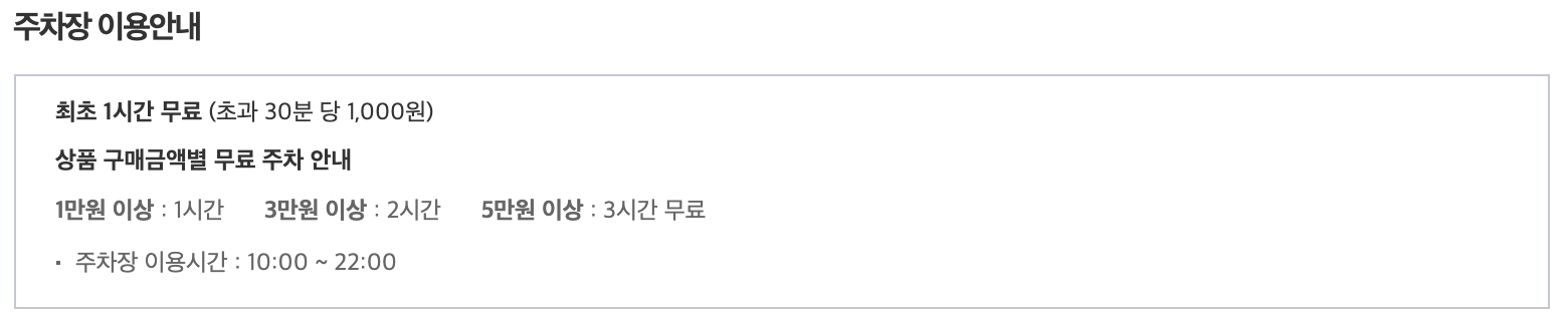 상품 구매금액에 따라 무료주차 혜택도 지점별로 다르며, 주차이용요금도 차이가 있습니다.